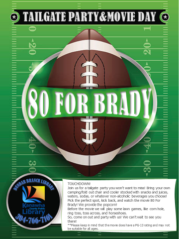 Join us for a tailgate party you won't want to miss! Bring your own camping/fold out chair and cooler stocked with snacks and juices, waters, sodas, or whatever non-alcoholic beverages you choose! Pick the perfect spot, kick back, and watch the movie 80 For Brady! We provide the popcorn!