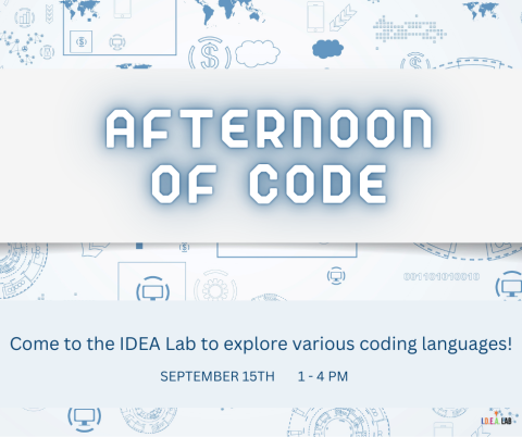 Stop by the IDEA Lab for our very first Afternoon of Code! Get hands-on experience at coding with a variety of fun ways to learn, like creating a 3D game, coding your own self-portrait, or even making art through coding!