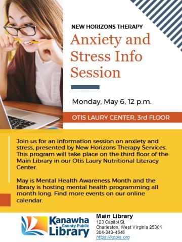 Join us for an information session on anxiety and stress, presented by New Horizons Therapy Services. This program will take place on the third floor of the Main Library in our Otis Laury Nutritional Literacy Center. The Center is located on the Capitol Street side of the library, near our newspapers collection.