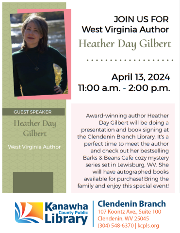 Award-winning author Heather Day Gilbert will be doing a presentation and book signing at the Clendenin Branch Library. It's a perfect time to meet the author and check out her bestselling Barks & Beans Cafe cozy mystery series set in Lewisburg, WV. She will have autographed books available for purchase! Bring the family and enjoy this special event!