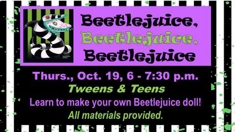 HAHAHA You said his name three times. Join us for a night of " The Ghost With the Most"! Miss Danielle will walk you through how to make a Beetlejuice doll. She can't wait to see what you come up with.