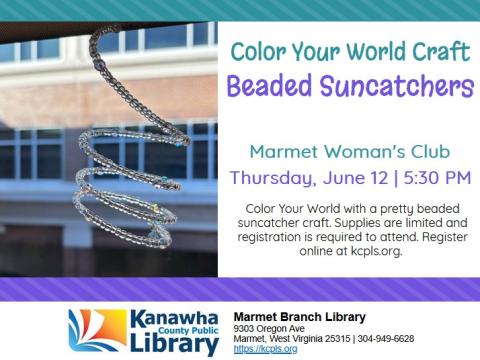 Color your world with a pretty beaded suncatcher craft. Supplies are limited and registration is required to attend.