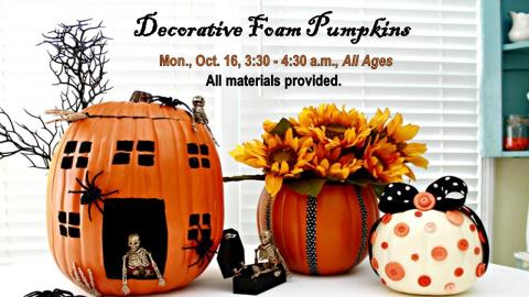 In this special fall craft session, use your imagination when you decorate foam pumpkins! All materials will be provided, just bring a vision of what you want your pumpkin to look like!