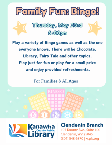 Play a variety of Bingo! games as well as the one everyone knows. There will be Chocolate, Library, Fairy Tale and other topics. Play just for fun or play for a small prize and enjoy provided refreshments.