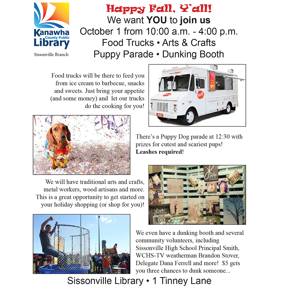 Hapy Fall Y'all! The Library is OPEN and we want YOU to show off your arts, crafts and creations! Join us at the Sissonville Library for a fun fall day of shopping, games, food, and more! There will be crafters and vendors, food trucks, a basket raffle, puppy costume parade, and dunking booth.