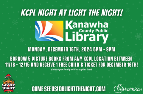 Thanks to KCPL's generous community partner, the Charleston Dirty Birds, readers who borrow 5 picture books from any KCPL location between Nov 18 - Dec 15, 2024 earn a FREE CHILD'S TICKET to attend KCPL Night at the Dirty Bird Salango Law Light the Night on Monday, December 16 from 5 - 9 pm. Storytime and photo opps with Dusty will be at 6 pm.