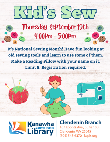 It's National Sewing Month! Have fun looking at old sewing tools and learning to use some of them. Make a Reading Pillow with your name on it. Limit 8. Registration required.