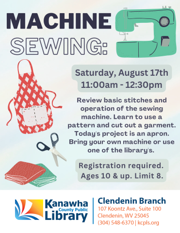 Review basic stitches and operation of the sewing machine. Learn to use a pattern and cut out a garment. Today's project is an apron. Bring your own machine or use one of the library's. Registration required. Limit 8.