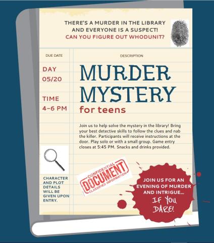 Join us to help solve the mystery in the library! Bring your best detective skills to follow the clues and nab the killer. Participants will receive instructions at the door. Play solo or with a small group. Game entry closes at 5:45 p.m. Snacks and drinks provided.