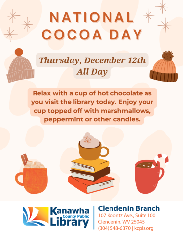 Relax with a cup of hot chocolate as you visit the library today. Enjoy your cup topped off with marshmallows, peppermint or other candies.