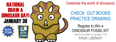 Whether you love T-Rexes, Triceratops or Stegosaurs, it's a great opportunity to let your creativity shine by drawing these ancient creatures in whatever way you choose! Stop in Children's Services to get books or movies on dinosaurs. Use our how to guides to get the hang of drawing them. Register to win a Cosci Dinosaur Fossil Kit. (kit recommended for children in grades 2-6)