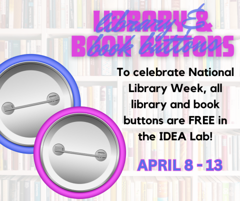 Show off how much you love your library by making a library or book button in the IDEA Lab! This week only, in honor of National Library Week, all library and book related buttons are free!