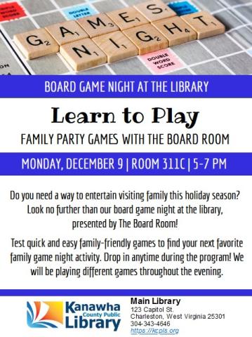 Join us for our Nerd Night for Adults program series. For our 2024 series, The Board Room will be joining us to teach various board and card games. In December, we will be playing games suited for the whole family.