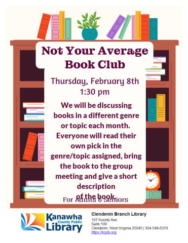 We will be discussing books in a different genre or topic each month. Everyone will read their own pick in the genre/topic assigned, bring the book to the group meeting and give a short description of the book.
