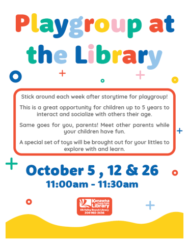 Stick around each week after storytime for playgroup! This is a great opportunity for your children to interact and socialize with others their age. Same goes for you, parents! Meet others parents while your children have fun. A special set of toys for this age group will be brought out for your littles to explore with and learn.