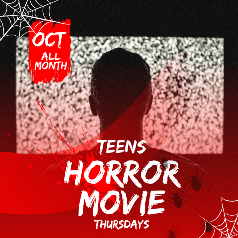 Come hang out in the Teen Zone and watch horror movies with us every Thursday from 12pm to 7:30pm during the month of October.
