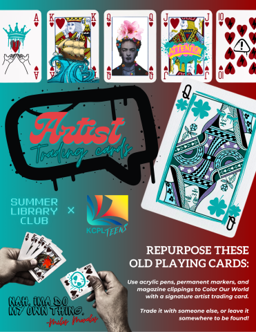 Drop by the Teen Zone to make Artist Trading Cards with paint pens, permanent markers, magazine clippings, and other miscellaneous materials. This is a great way to reduce, reuse, and recycle by giving old playing cards new life. Exchange your cards to make new friends and collect art, or leave them in the Teen Zone for others to find!