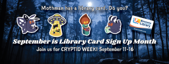 Don't miss our CRYPTID WEEK programs September 11-16, including Cryptid Crafts at Clendenin; Joe Perdue and Ron Lanham of Wild and Weird West Virginia, Cryptid Art, and Cryptids for Kids at Cross Lanes; a Cryptid Painting Class led by Denean Ayers of Appalachian Gothic at Dunbar, Elk Valley, and Main; Cryptid Day and Cryptid Storytime at Sissonville; Meet the Cryptids at St. Albans; and Cryptid Jewelry for Teens and Mini Mothman Wreaths at Main's IDEA Lab!