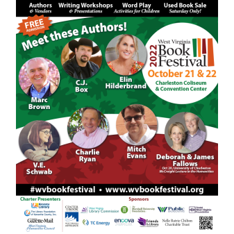 The 2022 West Virginia Book Festival will be held at the Charleston Coliseum and Convention Center on October 21 and 22, featuring bestselling authors Elin Hilderbrand, C.J. Box, V.E. Schwab, and Marc Brown, as well as local authors Charlie Ryan and Mitch Evans. Authors James & Deborah Fallows will be featured at the McCreight Lecture in the Humanities on October 20 at the University of Charleston. All events and programs are free and open to the public.