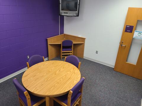 Riverside study room A23, complete with round table, chairs, CRT TV with DVD player, and small corner desk with chair
