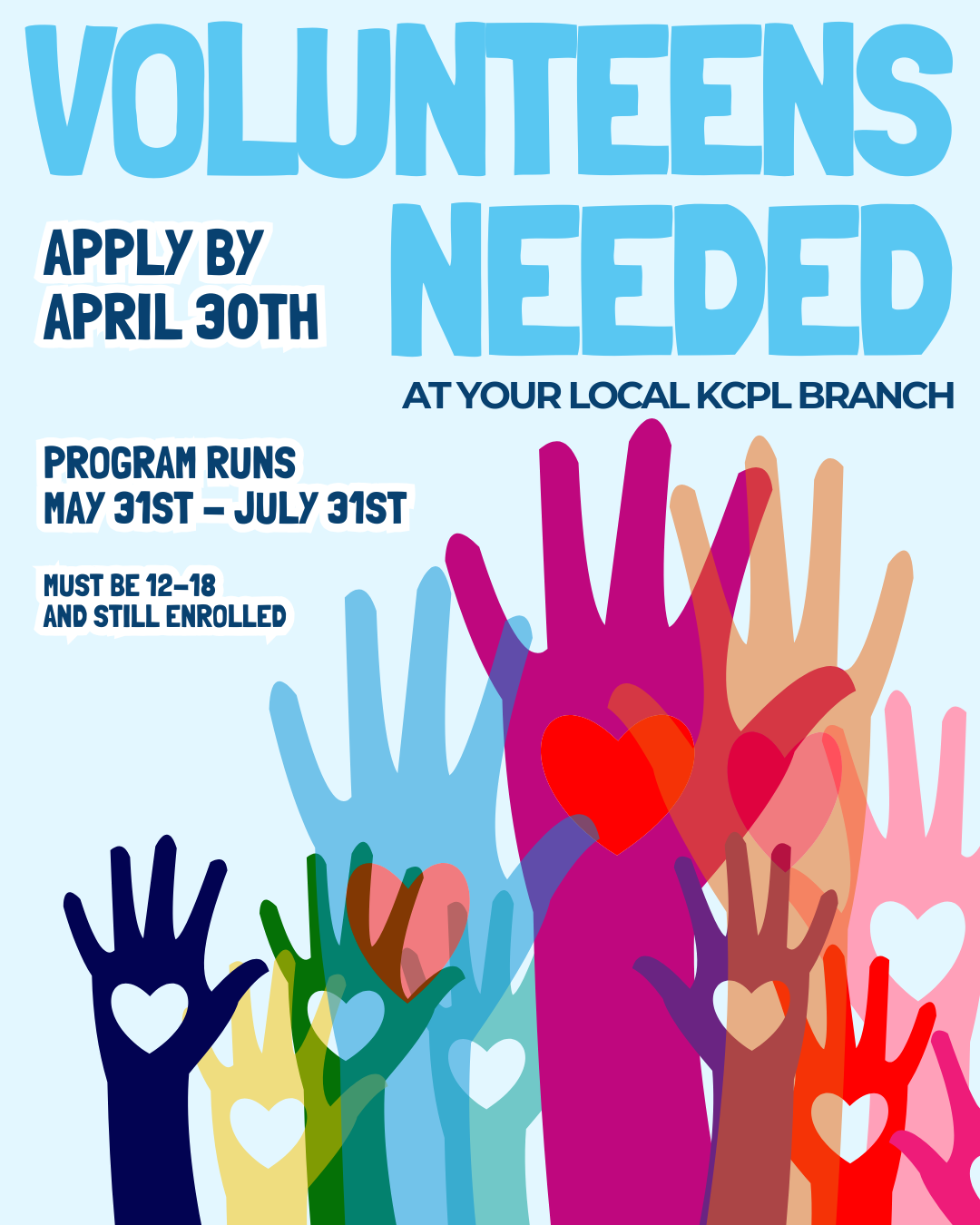 All applications must be turned in to the proper branch by April 30th, 2025. Teens wanting to volunteer on the Children's floor at Main should indicate such under the "WHICH BRANCH WOULD YOU LIKE TO VOLUNTEER AT?" portion. A physical application can be picked up at any Kanawha County Public Library building. Questions can be directed to our Teen Services Librarian by emailing noelle.robinson@kcpls.org or calling (304)343-4646 x1251.